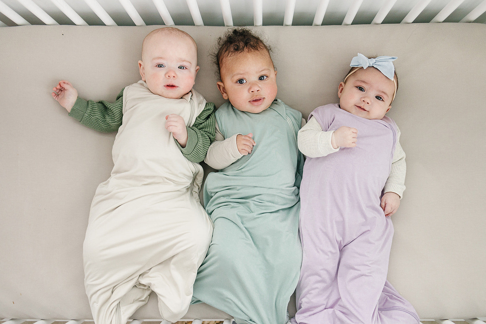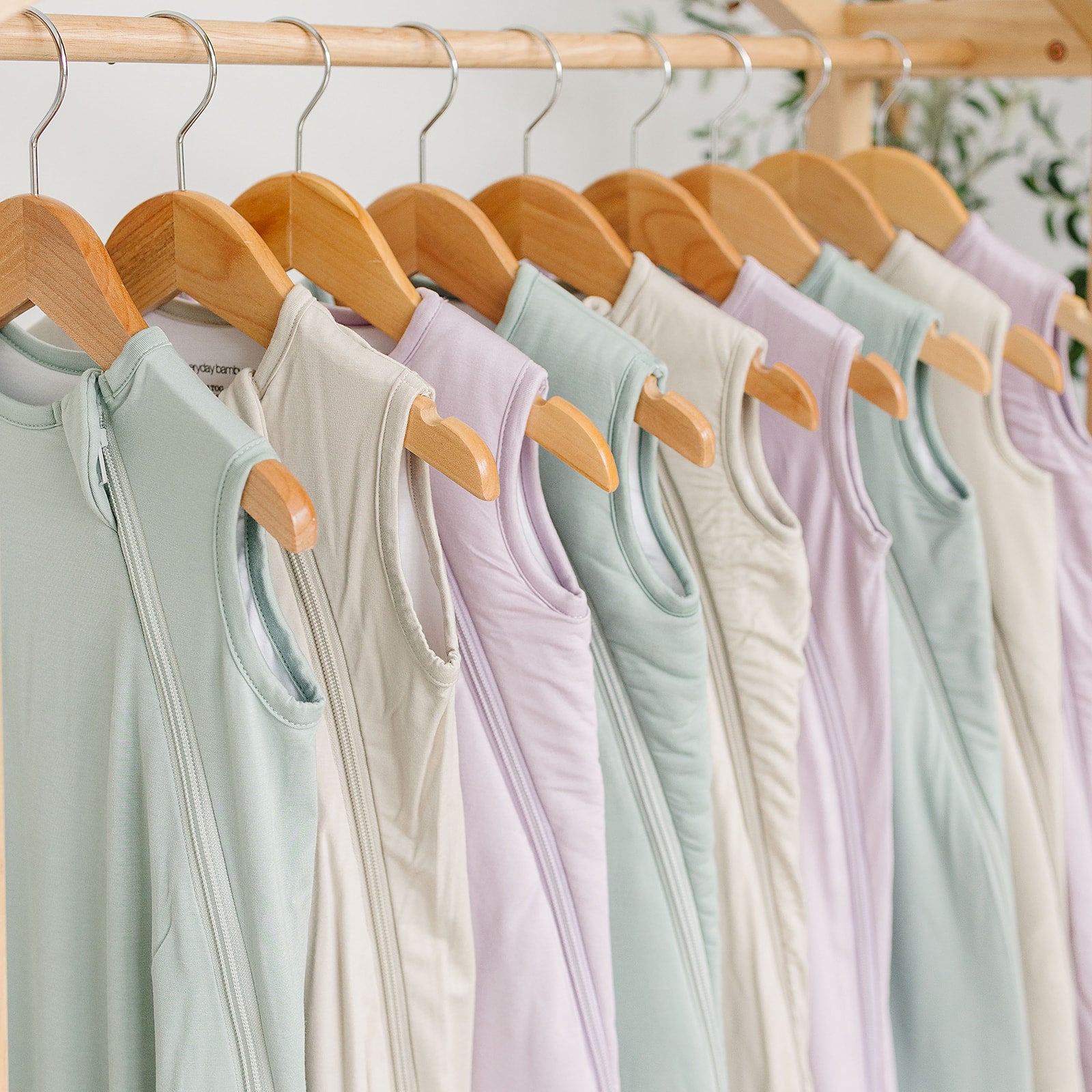 Our Misty Mint, French Lavender, and Better Beige Cloudhug™ Sleep Sacks—all in different thicknesses—are hanging together, ready to keep your little one cozy year-round!