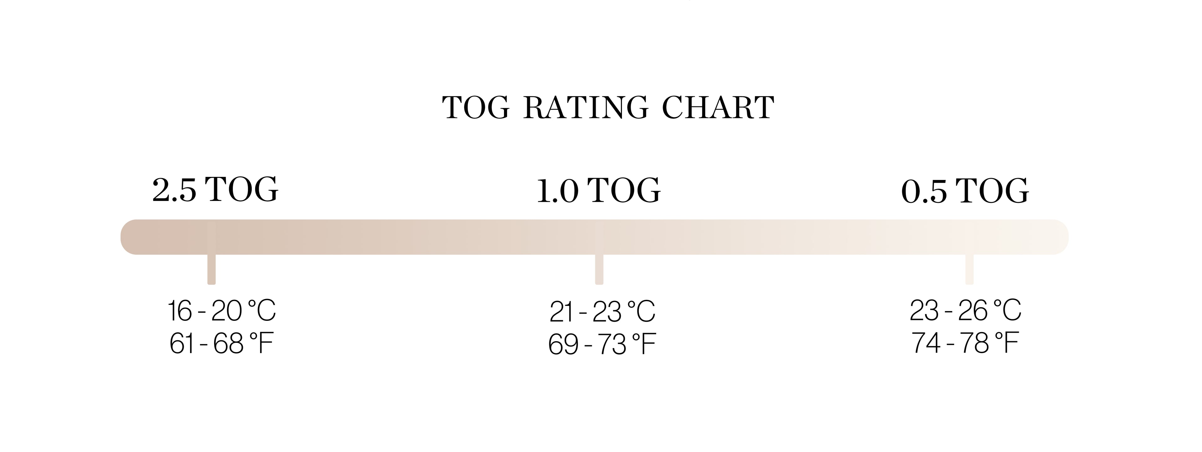 TOG (Thermal Overall Grade) is a rating system used to measure warmth and how quickly a fabric uses heat. It's the standard for choosing the right sleeping bag for your baby based on the temperature in your nursery. During cooler months, opt for a higher TOG rating for extra warmth, while lower TOG ratings are ideal for warmer months.